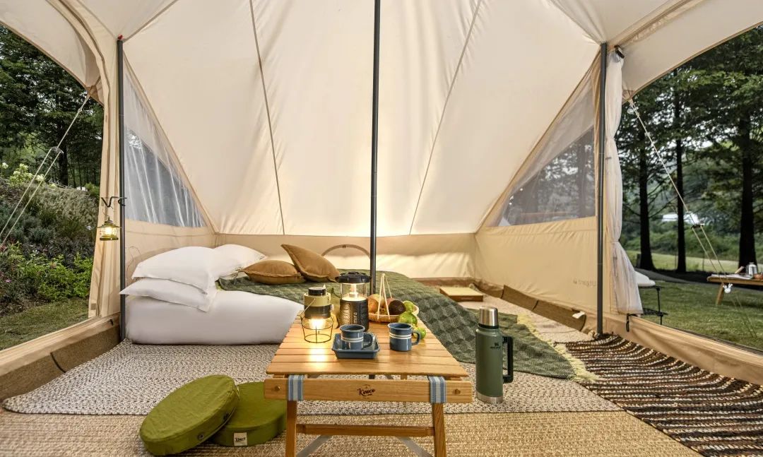 藏身于超大野奢度假园综合体——德清上渚山奇幻谷中,以全境森林为背景,漫山杜鹃谷为邻,面朝整面坡度原生态茶园,坐拥全景绿境。营地主体包含12间拥有独立整体卫浴、空调、悬挑阳台的客房帐篷和3个野趣公共空间,开启了全新的“森系茶野”风。