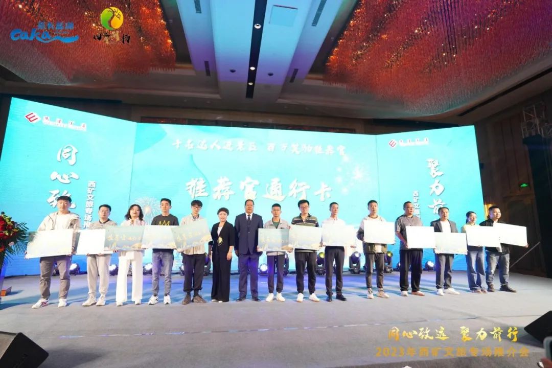 西部矿业集团有限公司总经济师徐宝宁致辞 推介会上,西矿文旅公司对茶卡盐湖景区及伊吾胡杨林景区进行专场推介。对长期输送游客的旅行社单位进行表彰奖励,为22家最佳合作旅行社颁奖。现场发起“千名达人进景区 百万奖励推荐官 茶卡盐湖、伊吾胡杨林全国招募推荐官”活动,为旅游博主“秦鹏”、“慧慧说新疆”颁发“旅游推荐官”聘书,为20多位自媒体创作者颁发“推荐官通行卡”。同时,携程、美团、抖音等平台与西矿智旅签订2023年营销服务合作协议,茶卡盐湖景区与伊吾胡杨林景区分别与200余家旅行社签订2023年旅游合作协议。