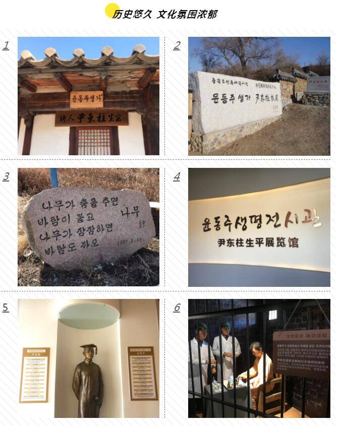 尹东柱是中国朝鲜族著名诗人,尹东柱故居为传统的朝鲜族瓦房,建有展览馆、雕像、纪念品展馆、凉亭、石碑等设施,院内石碑上刻着尹东柱的《序诗》《忏悔录》《路》《等待黎明》等诗作。