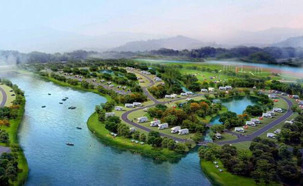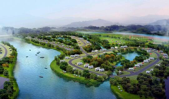 “山水灵韵楠溪江,天然玉成露营地”,楠溪江国际房车露营公园的30个房车停泊车位已经用灌木互相隔离,整个露营地的草坪已经铺好,各类房车也已经陆续到位,每个停泊车位上都有可供烧烤及配套设施的预留空间场地内有可移动式的木屋,长400多米的木质栏杆,方块条石铺就的小路,整个公园景观独特,别具一格,建筑风格充分展现了楠溪江的韵味。