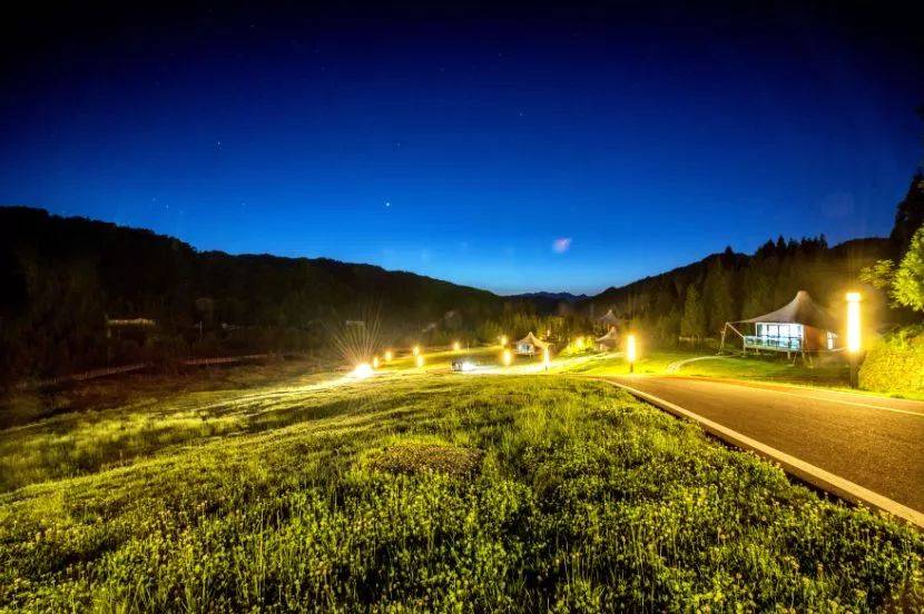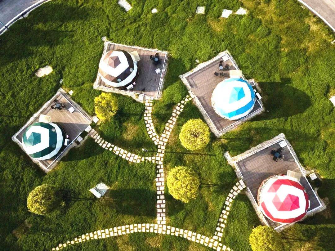 草地郁郁葱葱,星空帐篷毗邻栉比,不远处的球型帐篷交错相间影影绰绰。