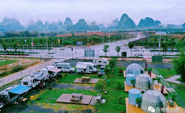 营地按照国际标准规划建设,通过结合当地地理环境、旅游特色,融合阳朔独特山水风貌,打造具有高品质的房车露营地。清亮透明的玉龙河水湾曲地由远而来,绕着一座座绿色小岛,阳朔特有的凤尾竹微笑着,轻风中摇曳着腰姿迎接八方游客,以竹围合的中式院落与西式生活的房车巧妙结合,一种全新的户外体验方式让人耳目一新,东方的舒适与西式的工业文化在自然中更显魅力。