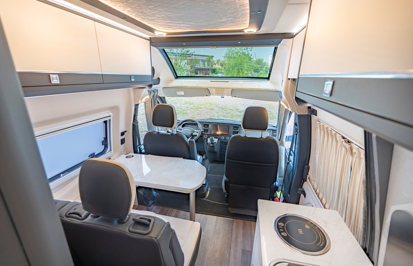 全车采用乘用车级环保软质ABS开模内饰及E0级环保家具板材,没有甲醛和异味。特莱尔行驻车一体顶置空调、进口2000W带高原模式燃油暖风,最大功率107KM,最大马力145PS,峰值扭矩355牛米,最大载重量4250Kg。整车标配460AH锂电、3000W逆变器,105L净水箱、66L灰水箱。40L大容量热水器、可以满足一家出行需要。瑞弗A700根据车辆不同部位特征,做了针对性的隔音隔热强化处理,比如:3mm定制阻尼垫;30mm的高闭孔率的保温棉,隔热降噪;10mm带铝箔的保温棉,覆盖车内钣金;5mm轻质内饰全覆盖,形成第二重热断桥。驾驶室上方安装了一块天窗,极大增加了车内的通透及采光通风性,将车辆的通透感提升到极致。车后侧安装了定制的金属后爬梯及自行车架。另外,启界A700也采用了盲窗外凸的设计理念,使后床的长度可以达到2.05米,这在同级产品中是极为少见的。主驾驶座椅后方则是整车的就餐区域,是以双人连排座椅+餐桌的设计,餐桌还带有可拓展功能,为日后使用提供了便利性,双人座椅则采用的是乘用车级别的设计,填充比较饱满,头部带有头枕,还配置了扶手和安全带,日常行车时也可以乘坐,这样整辆车在行车过程中则可以乘坐四个人。卫生间采用的是一体成型设计,保证了整体性的同时,美观、防水等方面也表现优异,地面为双地漏设计,解决了停车不平时也洗澡水排放不干净等问题。另外,车内还配备了顶部进口Max换气扇、一体式淋浴花洒、晾衣杆等等小功能。