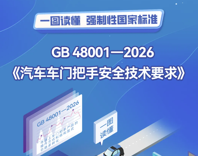 工业和信息化部组织制定的强制性国家标准《汽车车门把手安全技术要求》(GB 48001—2026)近日由国家市场监督管理总局、国家标准化管理委员会批准发布,将于2027年1月1日起实施。