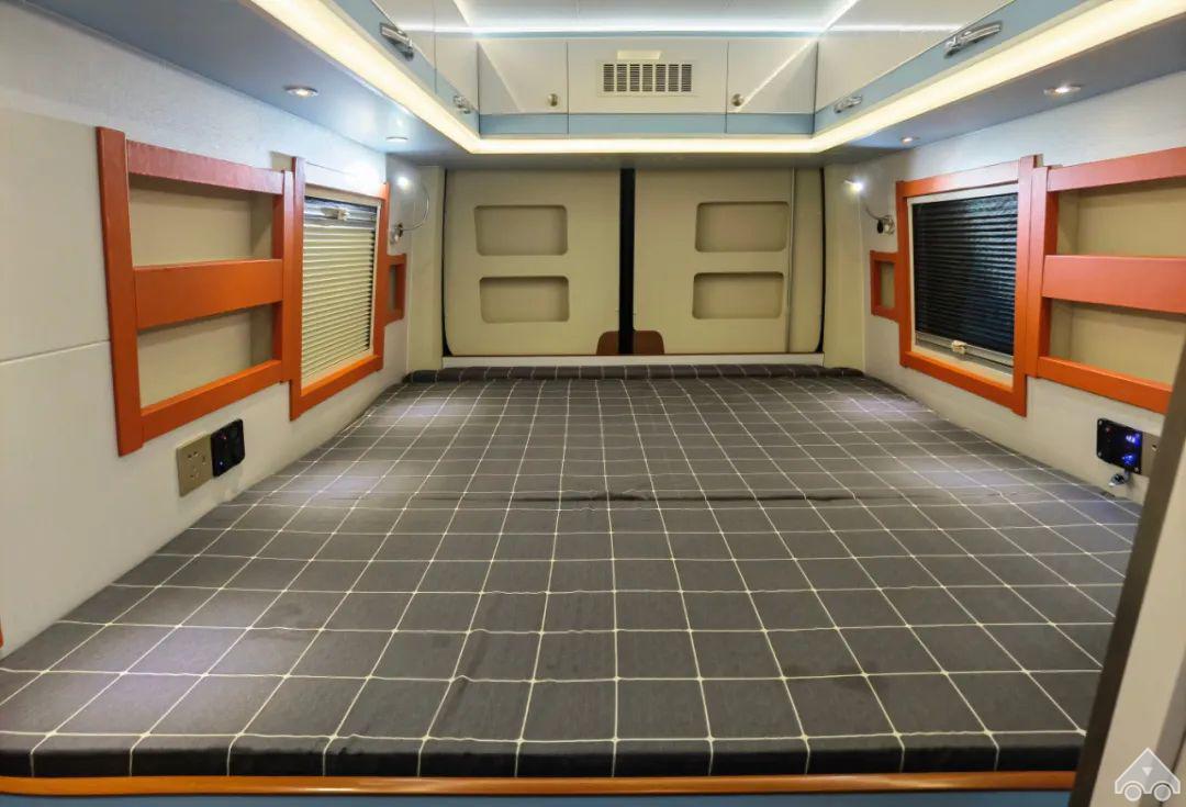 顶部配有单控照明系统以及氛围灯带,驻车空调安装在车底位置,与原厂的行车空调并联,提高了房车的通过性;侧面装有采用隐私玻璃的侧推窗,搭配了隐私帘和纱窗等,用于欣赏风景及空气流通;顶部两侧装有带锁的吊柜增加了车内的存储空间。