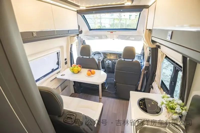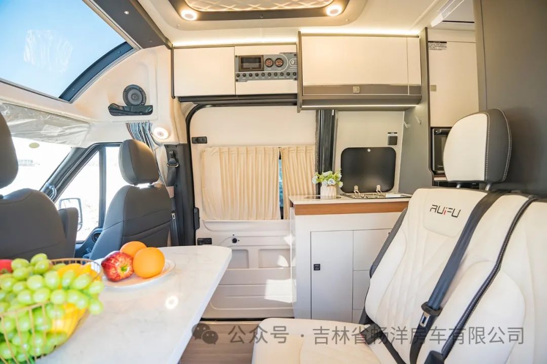 主驾驶座椅后方则是整车的就餐区域,是以双人连排座椅+餐桌的设计,餐桌还带有可拓展功能,为日后使用提供了便利性,双人座椅则采用的是乘用车级别的设计,填充比较饱满,头部带有头枕,还配置了扶手和安全带,日常行车时也可以乘坐,这样整辆车在行车过程中则可以乘坐四个人。