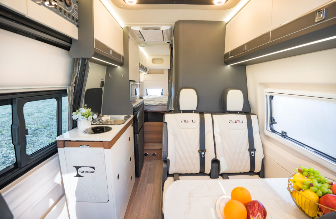 瑞弗启界A700基于福顺长轴高顶底盘打造,内部为标准的B型房车风格,单排客厅、厨房区以及独立卫生间,盲窗设计让后横置尾床满足高个子人群旅居,适合两人长途出行。官方指导价38.8万元,不仅仅是极具性价比的价格优势,还蕴藏着年轻时尚运动风格的设计,彰显玩家探寻“潮”“野”趣味。