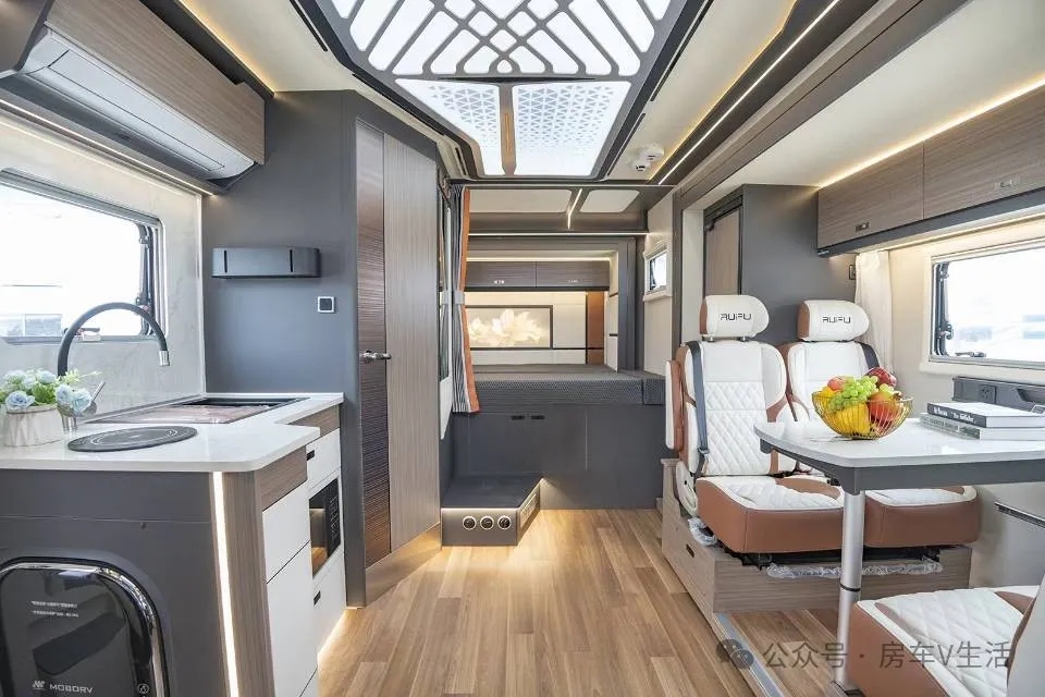 后横床降低了高度,方便老人孩子上下床。乘用车座椅,提供乘用车的安全保障。还带有一个独立四向滑移座椅,侧滑出来可以大角度放倒休息,后拓壁画灯创新设计,圆弧穹顶造型,扩展视野,营造出更大的空间感。