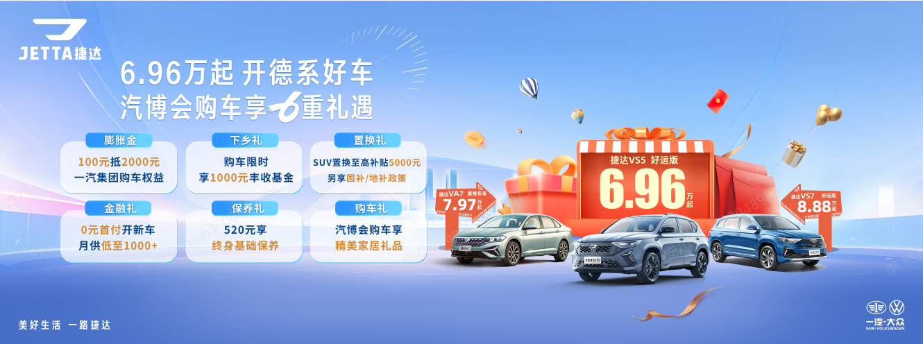豪气福利天天送,汽博会期间,捷达品牌特别推出了100元抵2000元的膨胀礼以及1000元丰收基金礼遇,同时针对VS5、VS7车型置换至高补贴5000元(另享国补/地补政策);针对分期购车用户,更是推出0元首付起月供低至1000+元的金融方案,520元即可尊享终身基础保养,汽博会期间前60名订车用户赠送价值500元家居好礼,诚意满满,覆盖消费者用车全周期,从看车、买车、养车一站式服务,不玩套路,花式福利,让消费者嗨购到底!