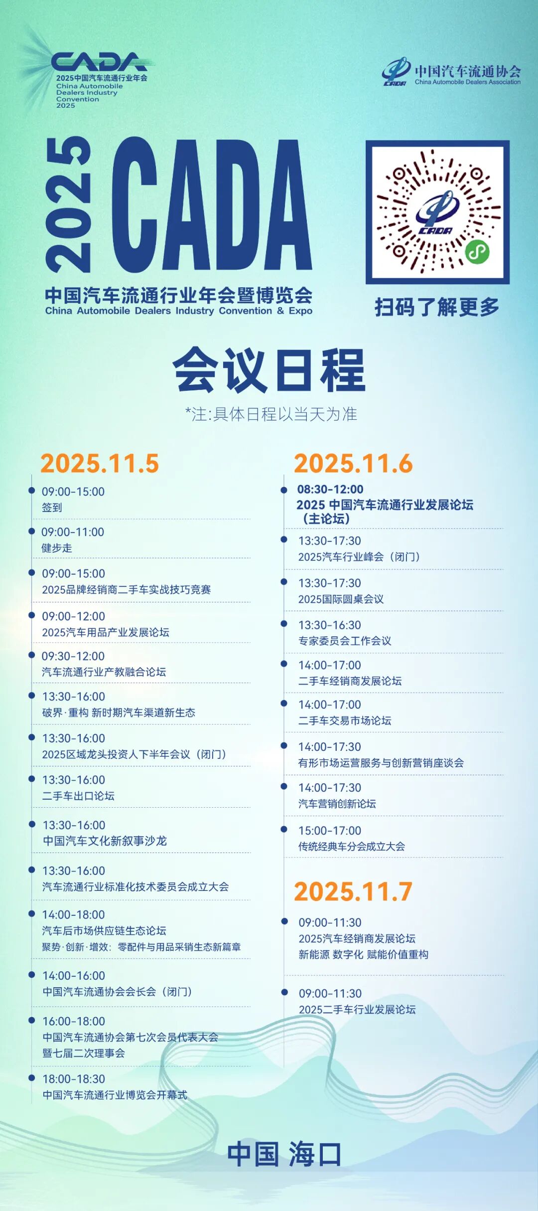 中国汽车流通协会定于2025年11月5日至7日在海口市举办“2025中国汽车流通行业年会暨博览会",本届年会以“以质驭变 向新而生”为主题,旨在搭建汽车经销商、汽车生产企业和后市场服务供应商等产业链行业企业跨领域、跨地域的沟通对话和交流合作平台。诚挚邀请广大行业同仁共襄盛举,热忱欢迎全体会员朋友回家团聚。具体日程如下: