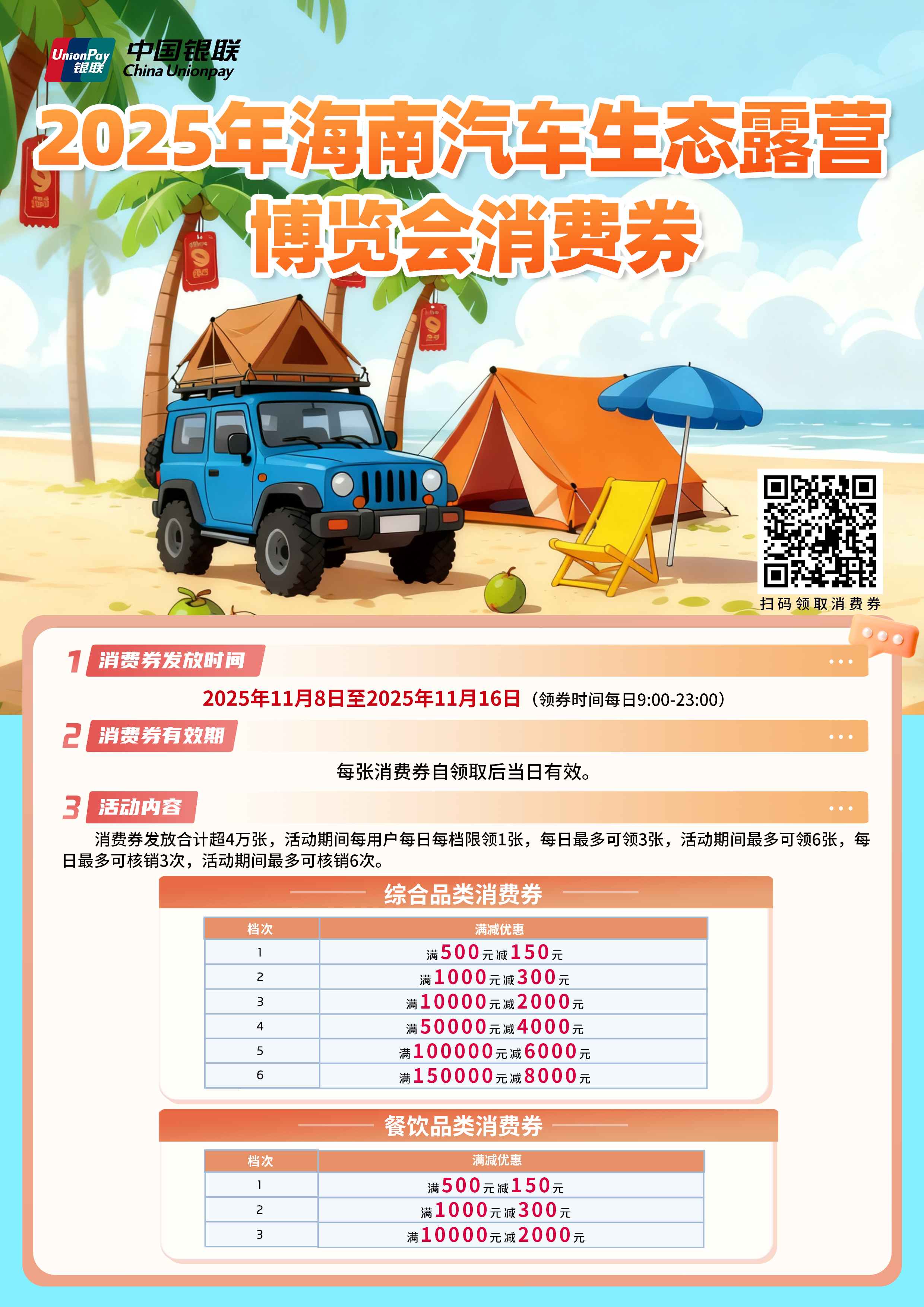 2025 海南汽车生态露营博览会暨海花岛露营生活嘉年华将于11月8日至16日在儋州市海花岛盛大开幕。作为海南省年内重磅的促销费活动,为了让游客在尽享露营乐趣时还能享受到更多的消费优惠,活动期间同步推出露博会专属消费券活动。游客通过云闪付APP即可领取多重福利,覆盖餐饮、住宿、露营装备、特色体验等多元消费场景。