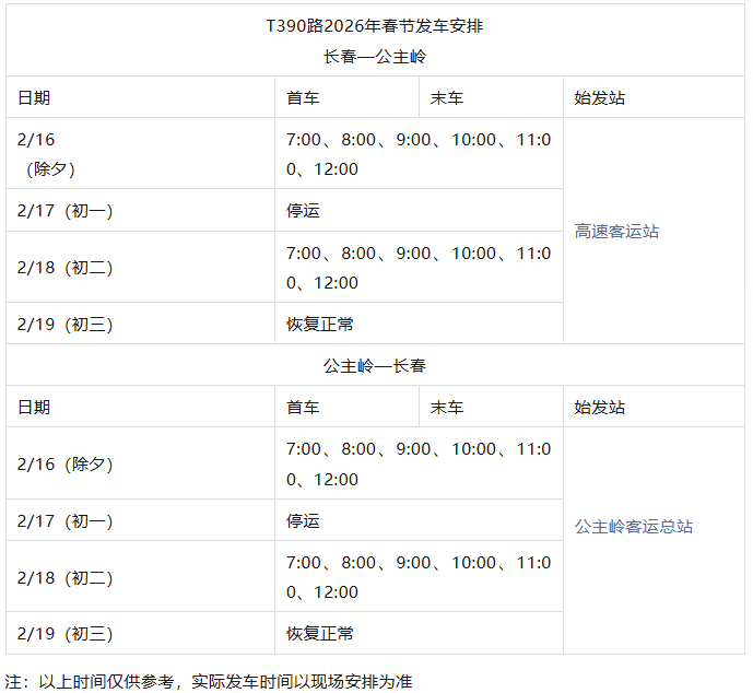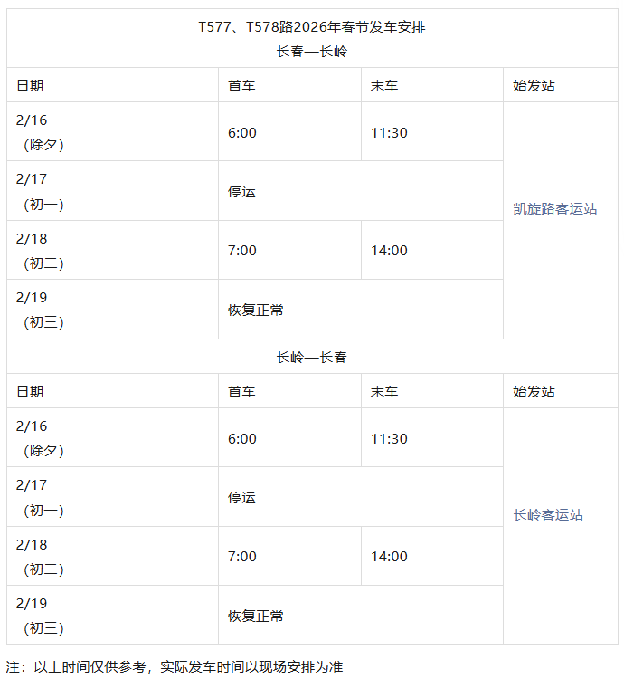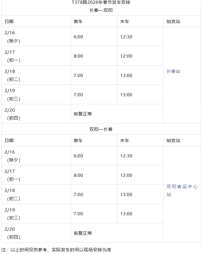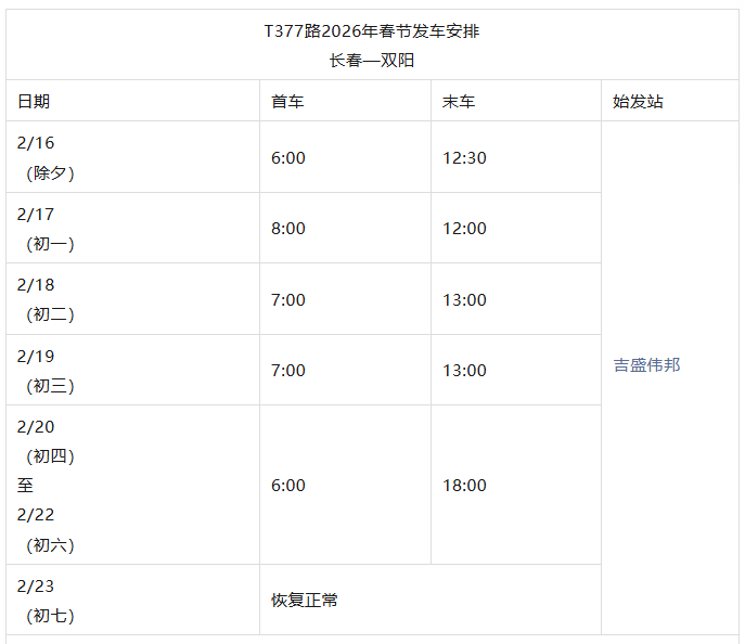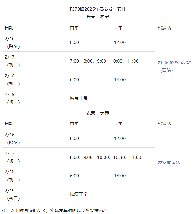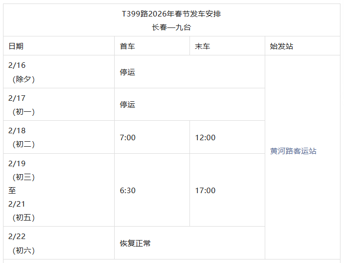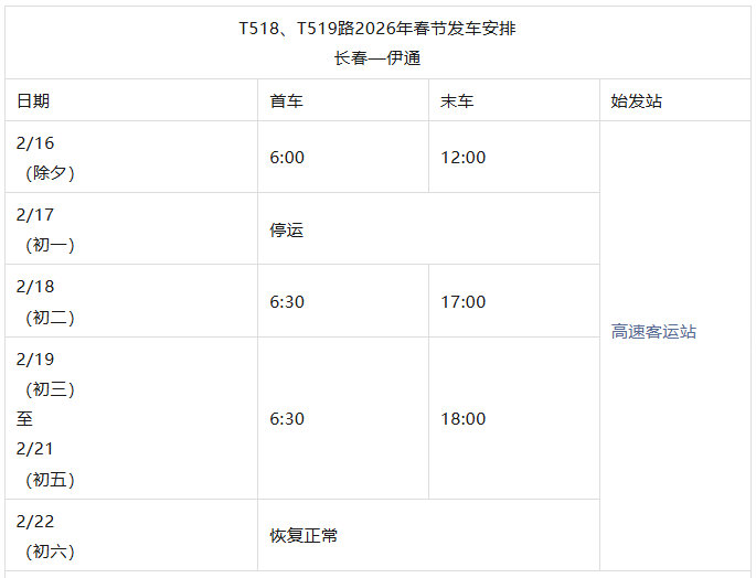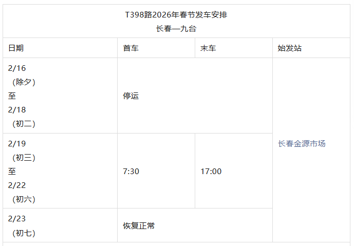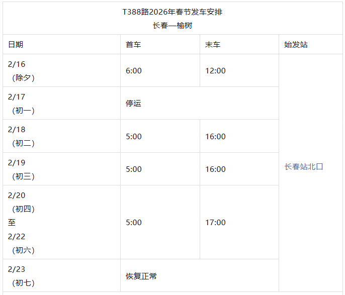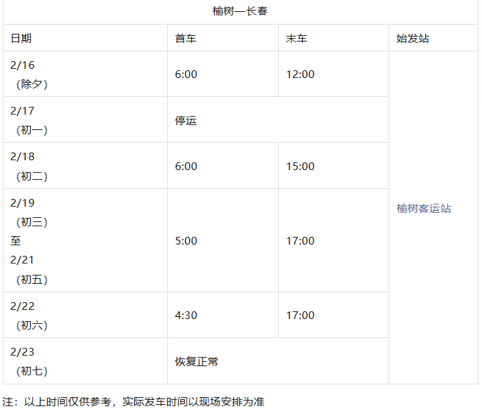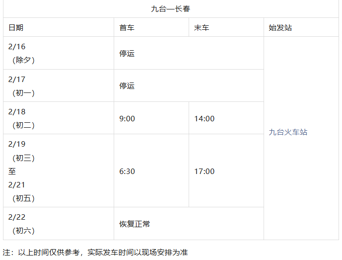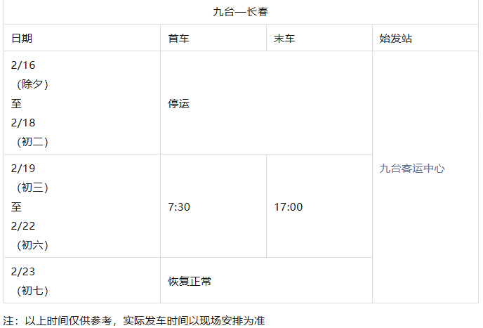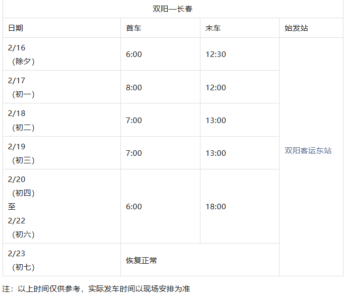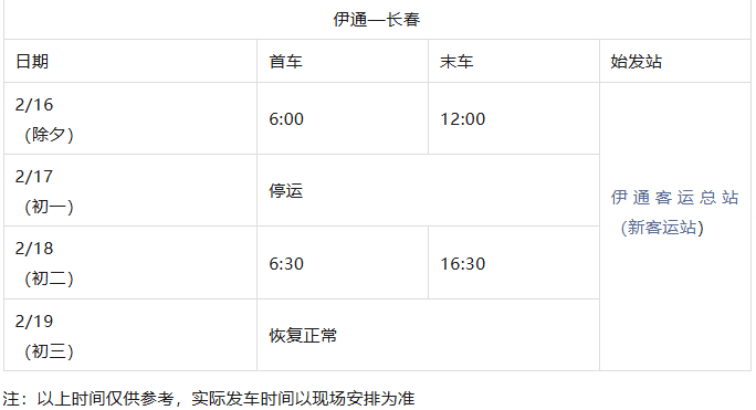 长春城际公交春节发车时刻表来了