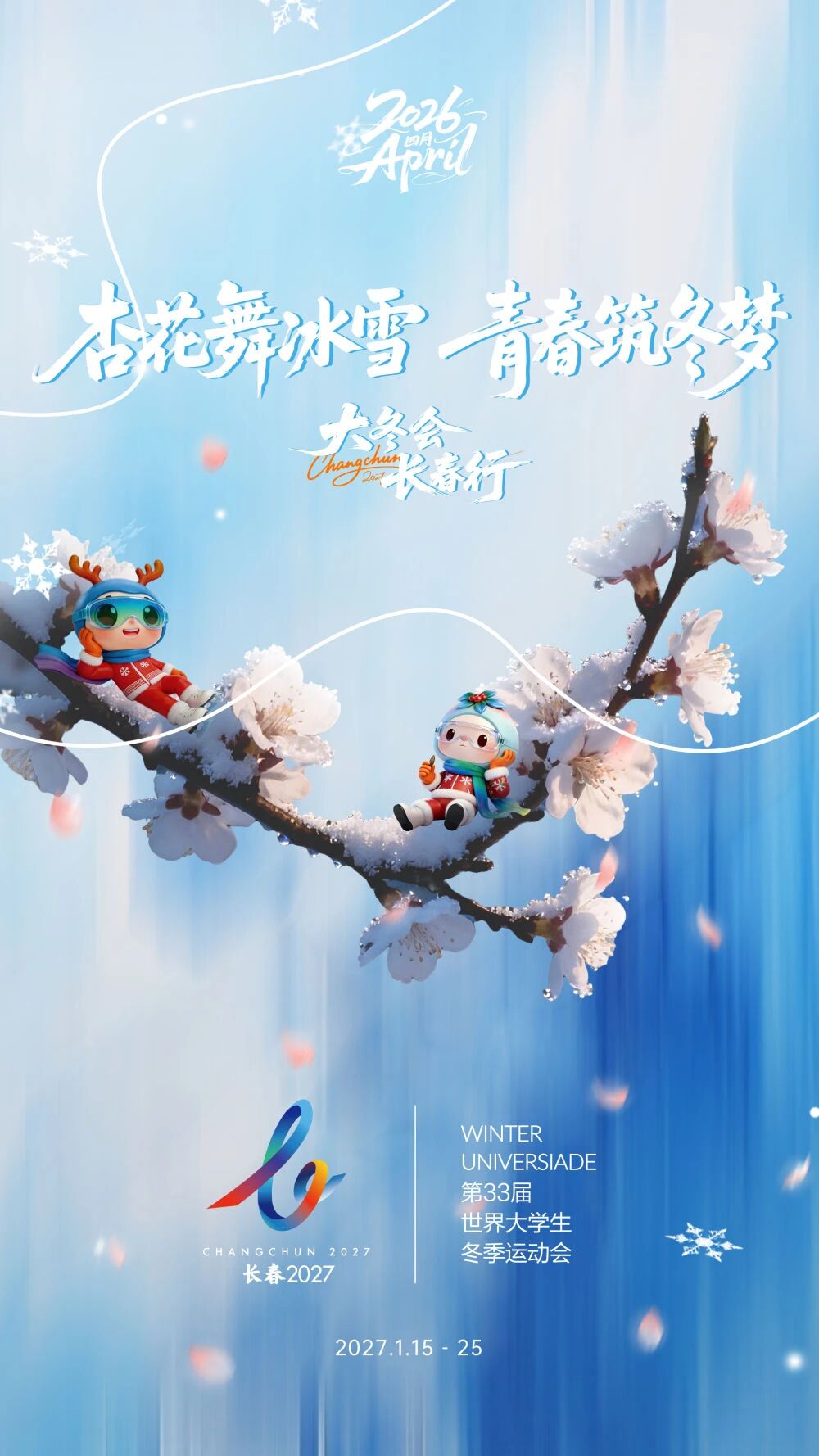 长春2027第33届世界大学生冬季运动会四月主题海报“杏花舞冰雪 青春筑冬梦”发布。