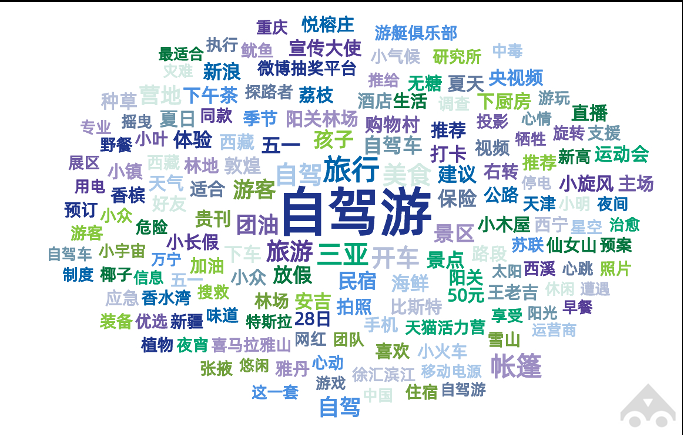 通过对“露营”、“房车”“自驾游”三大关键词的新闻内容做词频排名前五十的词云分析,可以看出其相关重复词约占30%以上。