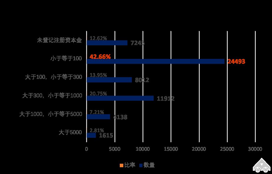 根据2018年我国发布的最新一版《三次产业划分规定》,我国第一产业共分1个门类(农、林、牧、渔业)、4个大类,第二产业共4个门类、43个大类,第三产业共分18个门类、50个大类,自驾游行业中的商务服务业占据绝对比重,为42.35%,远超排名第二的批发业。现存企业注册资本金中小于100万的企业占比为42.66%,而大于5000万家的企业仅为1615家,占比2.81%,体现了生活服务业的产业分类特点。