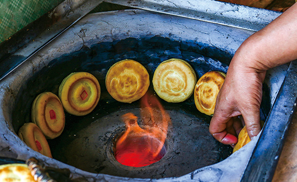 干炉是榆林镇川的一种传统面点。制作好的干炉边厚心凸中环凹下,形如小车轮,咬开后,中间空空如也,所以当地也称其为“闪塌嘴”。作为一种空腔面点,经炭火烘烤后,非常酥脆,细嚼有一种独特的油香味,因水分含量低,极耐储存,非常适合作干粮。为了适应不同人的口味,分别用盐或糖做馅料,即可制作出盐干炉和糖干炉。